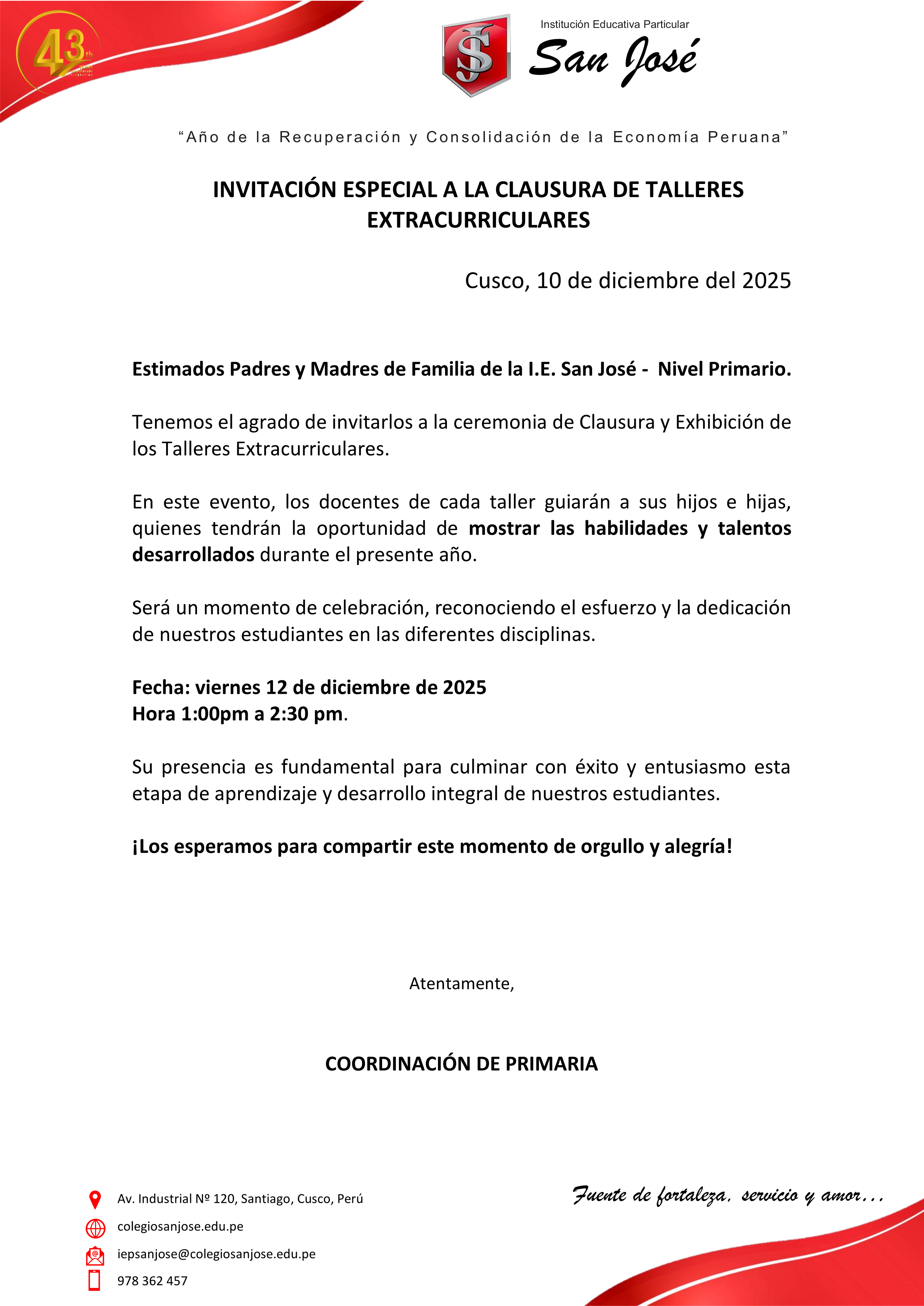 INVITACIÓN ESPECIAL A LA CLAUSURA DE TALLERES EXTRACURRICULARES