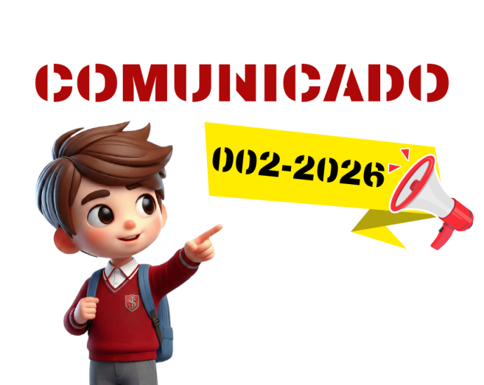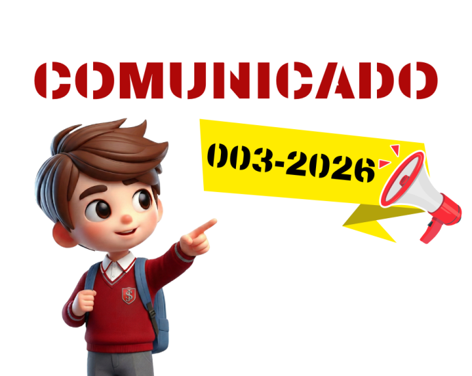 COMUNICADOS COMUNICADO 003-2026 COMUNICADO 002-2026 COMUNICADO 001-2026 COMUNICADO 015-2025 INVITACIÓN DICIEMBRE 2025 CLAUSURA DE TALLERES EXTRACURRICULARES COMUNICADO 014-2025 INVITACION DIA DEL LOGRO COMUNICADO 013-2025 2024-08-18