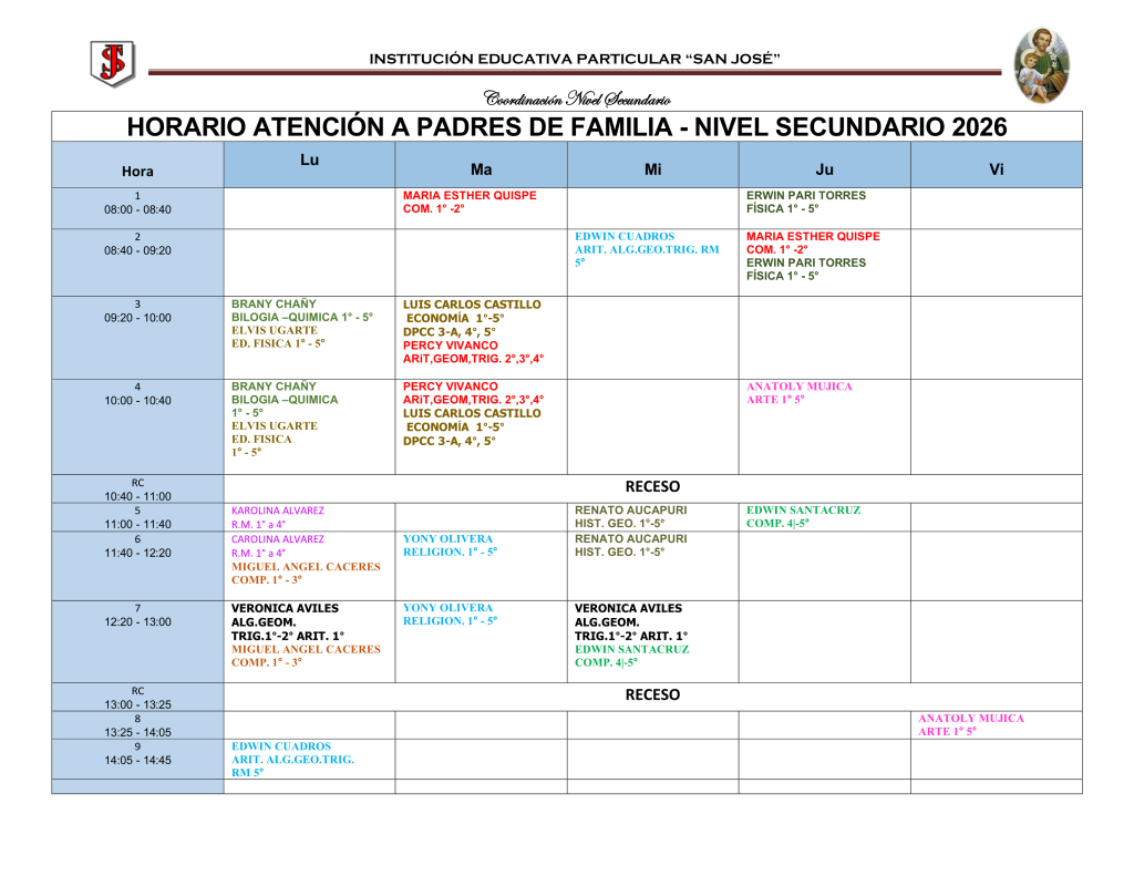 HORARIO DE ATENCIÓN - NIVEL SECUNDARIA