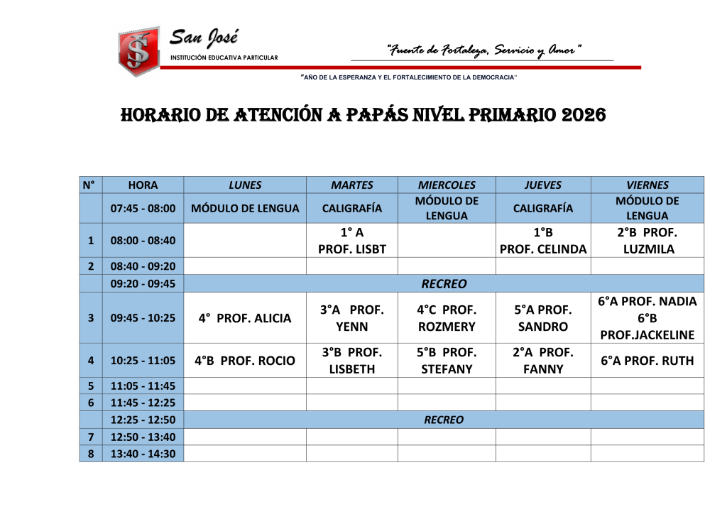 HORARIO DE ATENCIÓN - NIVEL PRIMARIA
